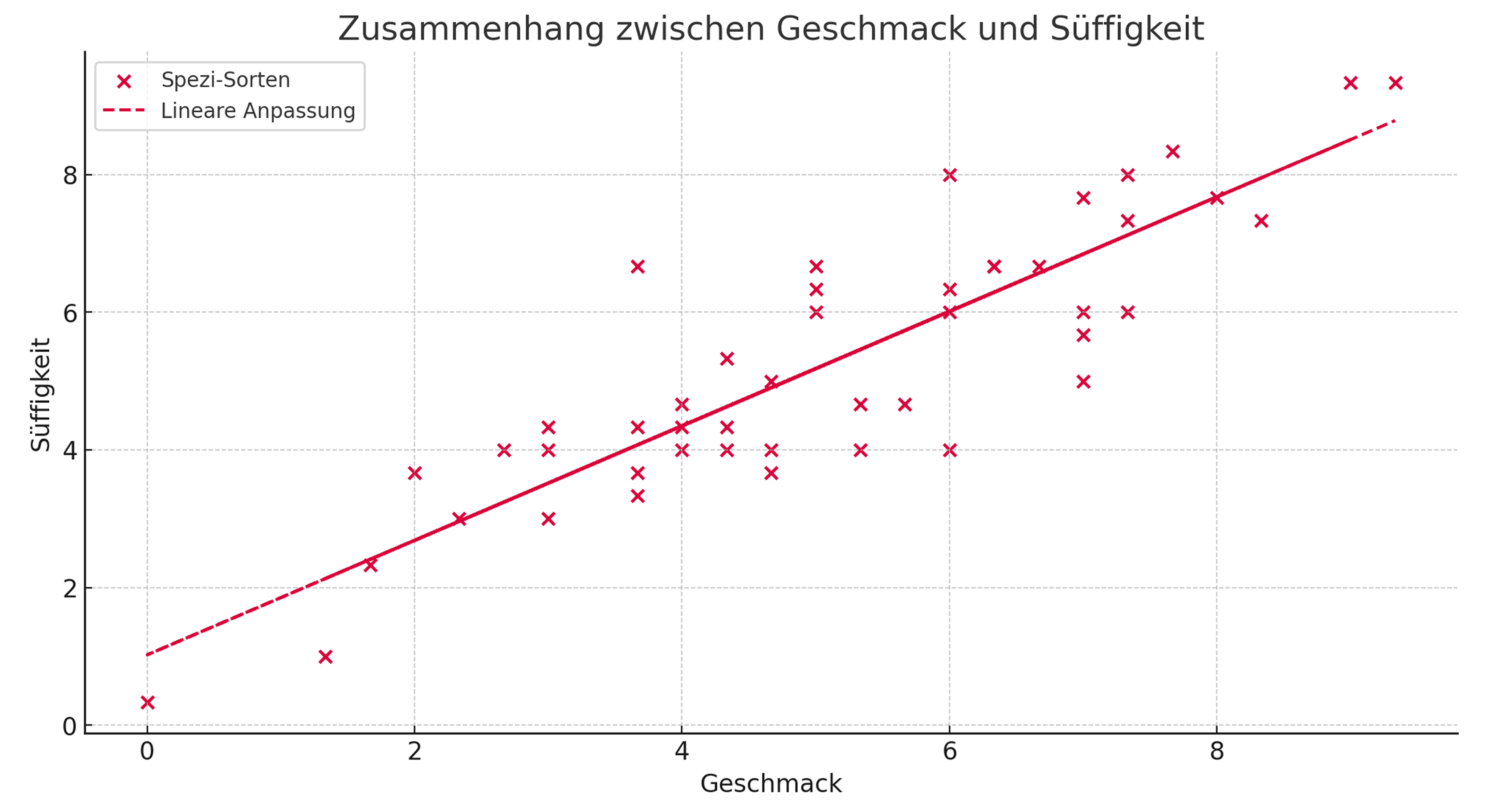 Diese Beobachtung wird durch eine statistische Analyse bestätigt. Der berechnete Korrelationskoeffizient von r = 0,87 zeigt eine starke positive Korrelation zwischen den beiden Variablen. Die enge Beziehung wird durch das Bestimmtheitsmaß von r² = 76,5 % untermauert, was bedeutet, dass etwa drei Viertel der Unterschiede in der Süffigkeit direkt durch die Geschmacksbewertung erklärbar sind. Zusätzlich liefert die lineare Regressionsanalyse eine Steigung von 0,83, was bedeutet, dass eine Einheit Verbesserung im Geschmack durchschnittlich mit einer Erhöhung der Süffigkeit um 0,83 Einheiten einhergeht. Der berechnete p-Wert von 9,86 × 10⁻¹⁶ ist dabei so gering, dass die Wahrscheinlichkeit, dass diese Korrelation zufällig entstanden ist, praktisch null ist. Damit ist der Zusammenhang statistisch hochsignifikant.