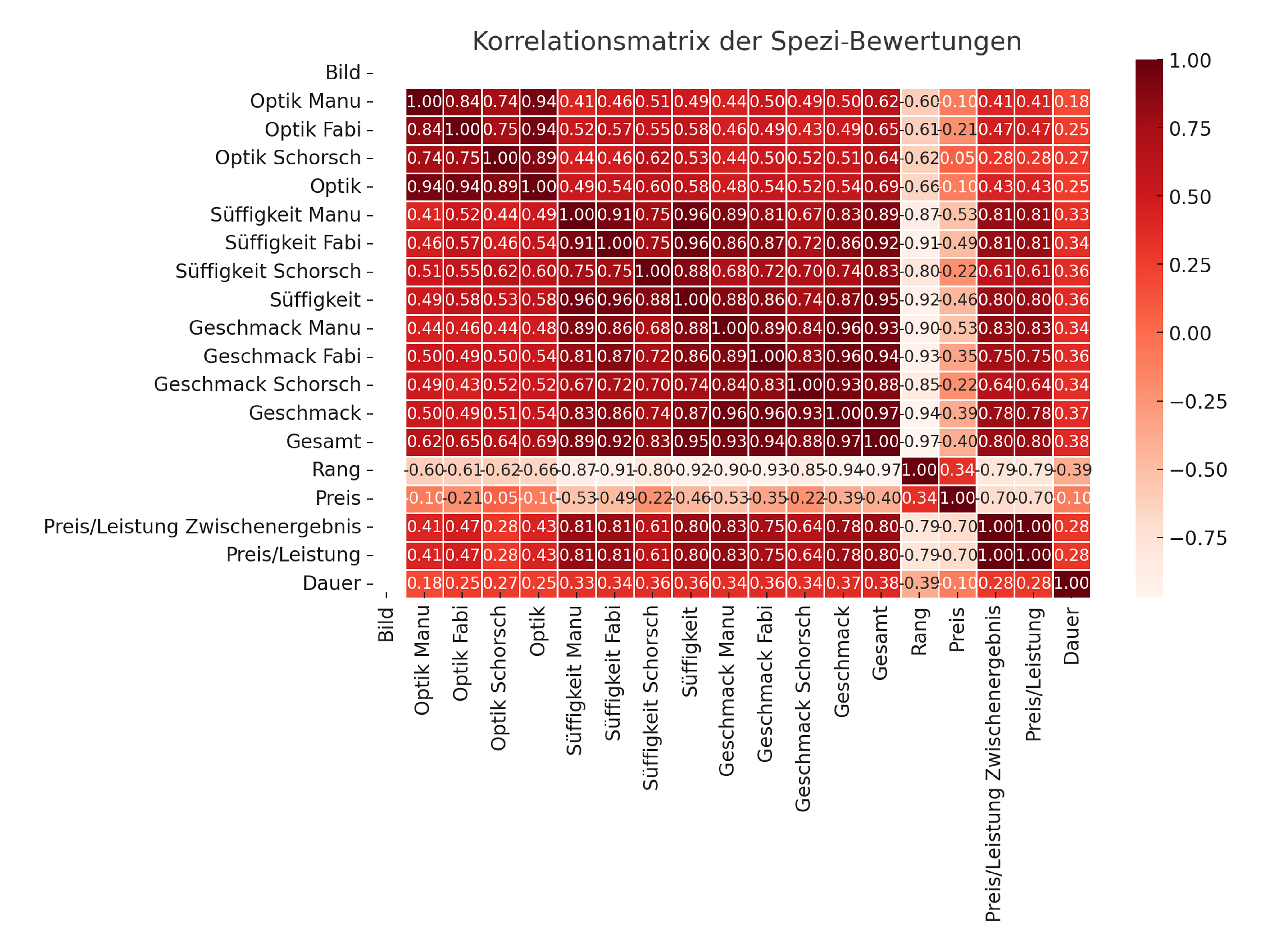 - Süffigkeit und Geschmack: Mit einer sehr starken Korrelation von 0.87 bestätigt sich die Erkenntnis aus den vorherigen Kapiteln – was gut schmeckt, trinkt sich auch gut.